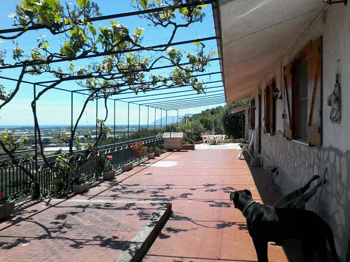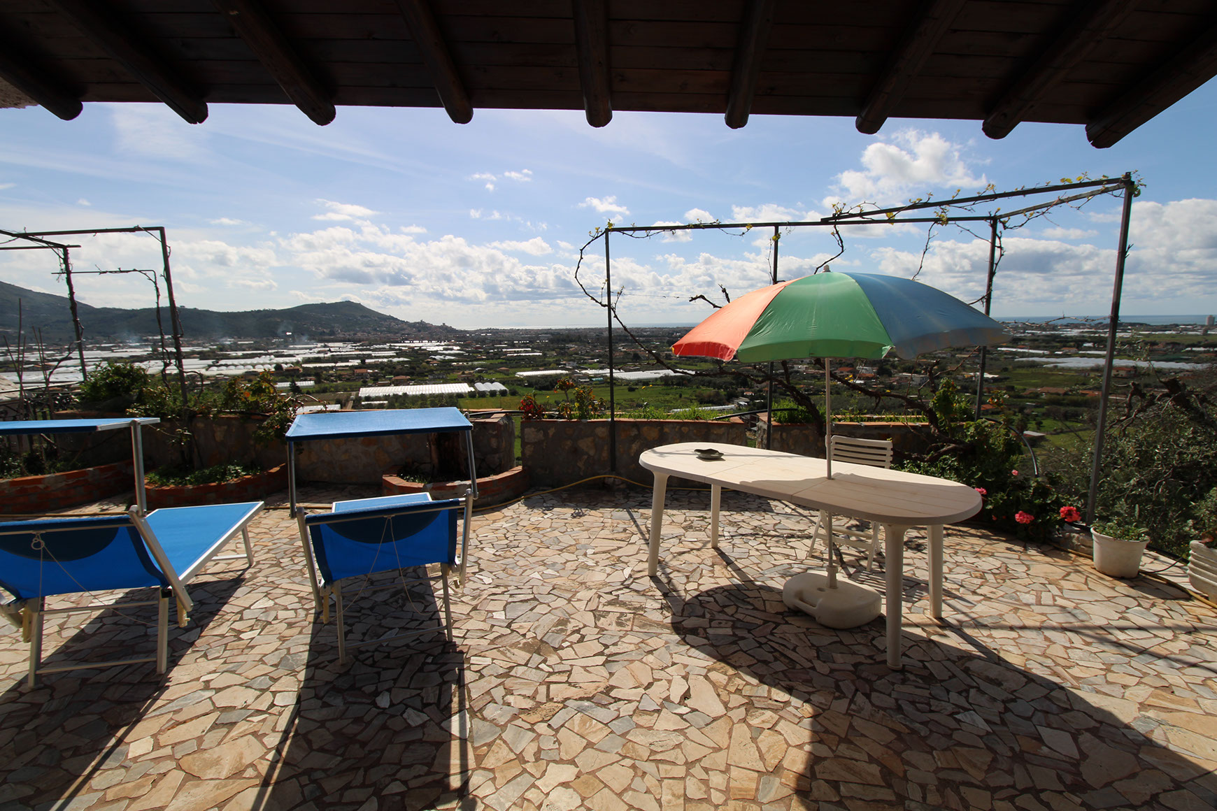 Terracina, zona collinare, 2000 mt. dal centro, con 400 mq. di terrazzo vista mare, monti, tempio di Giove, isola Ischia, isole Pontine e promontorio del Circeo. Villino unifamiliare di circa 100 mq. unico livello composto da ingresso salone con camino, cucina con termocamino e antistante tettoia, vano cantinetta, camera matrimoniale, cameretta e bagno; in buono stato e con varie rifiniture (termoautonomo con vano caldaia; vano pozzo + acqua di città, impianto illuminazione intera proprietà) + tettoia, cantina deposito attrezzi e piccolo vano esterno con 2° bagno; copertura a tetto; corte con posti auto interni ed esterni; terreno di circa 3.000 mq. in parte edificabile, attualmente piantumato ad oliveto con alberi da frutta e ornamentali.